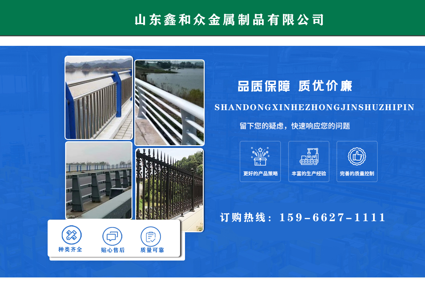 山东鑫和众金属制品有限公司主要产品有防撞护栏,桥梁护栏,道路护栏,河道护栏,不锈钢护栏等护栏。提供设计方案,一站式定制,包您满意价格优惠,欢迎来电咨询! 公司常年从事销售护栏防撞护栏,桥梁护栏,道路护栏,河道护栏,不锈钢护栏,桥梁钢护栏,河道灯光护栏等。产品广泛应用于桥梁、河道、旅游景区、道路、公路、公园、小区、景观、道路防撞等领域。 公司产品均采用优质不锈钢材料,符合相关标准。各种型号不锈钢复合管及护栏,质量严格把控。产品强度高、耐腐蚀、焊接牢固、抗冲击、性能好,防撞护栏结构简单、美观实用大方。 欢迎前来订购!...